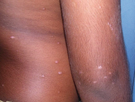 People with lighter tones might have dry skin that’s red or pink. Darker tones may be hyper-pigmented, showing different patches of deeper colour.